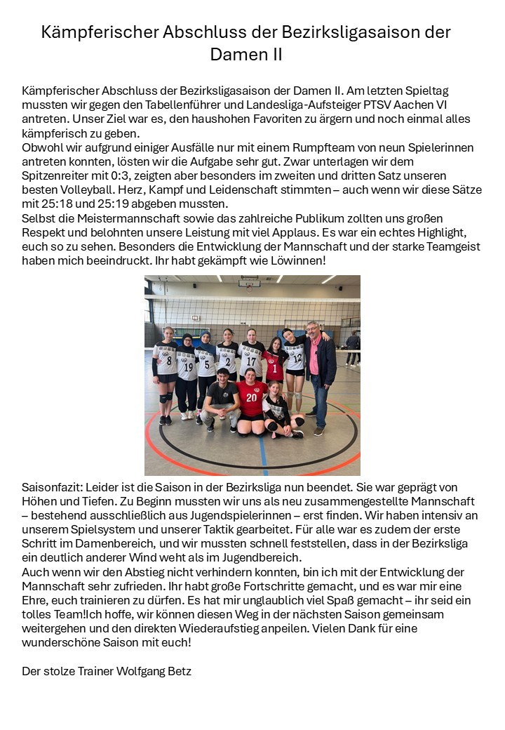 Leider konnten wir durch die sehr guten Angaben der Spielerinnen aus Aachen kein gutes, eigenes Spiel aufbauen, so dass wir leider mit einem 0:3 nach Hause fahren mussten.