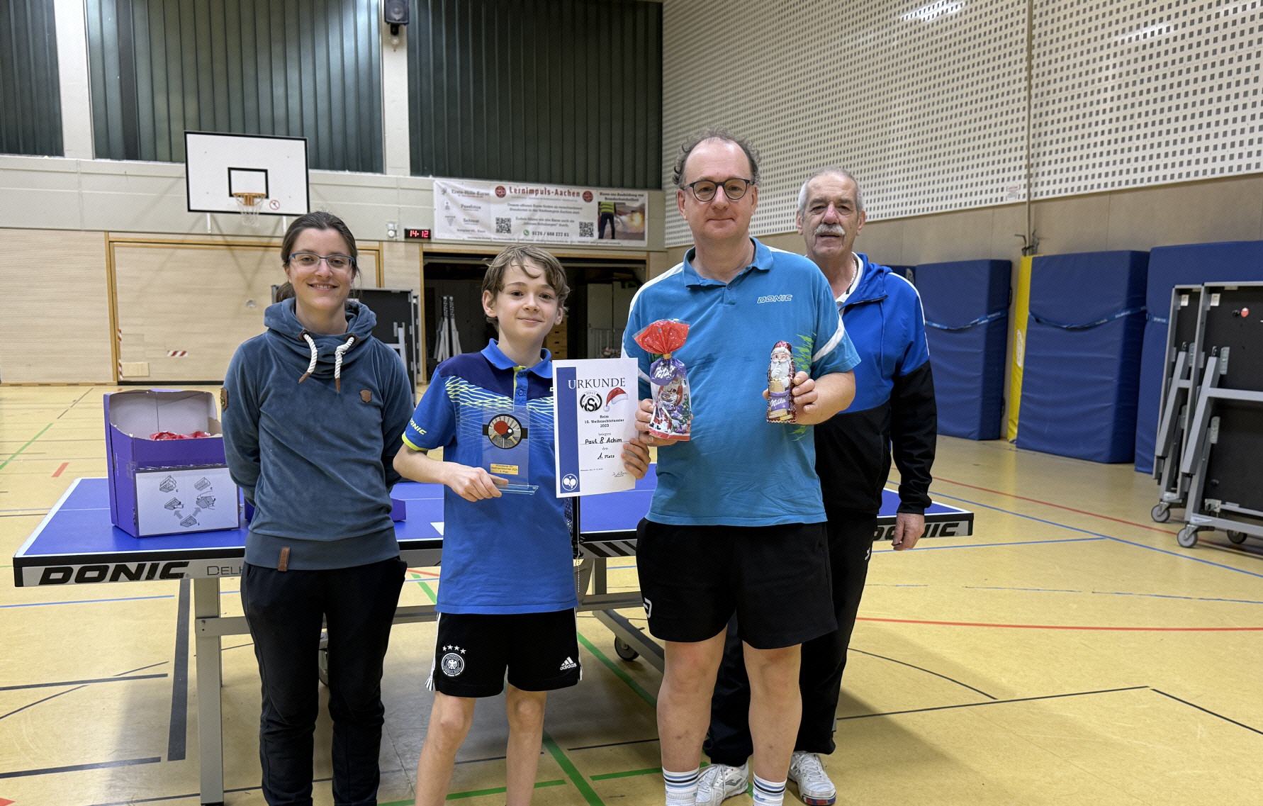 Auch in diesem Jahr fand das Nikolausturnier der Tischtennisabteilung wieder statt, wenn auch diesmal in der Krotthalle, wo deutlich mehr Pltz als in der Scherberger Halle war. Bei diesem Turnier treten traditionell ein Spieler bzw. eine Spielerin der Nachwuchsklassen mit einem Spielpartner (in der Regel Familienmitglied) an. So gab es diesmal sechs Teams, von denen sich im Modus "Jeder gegen Jeden" am Ende das Team "Leo und David" vor den Teams "Tim und Peer" (2. Platz) und "Achim und Paul" (3. Platz) durchsetzte! Bei Weihnachtsmusik und Kaffee und Kuchen hatten lle wieder einmal eine gute Zeit! Im nöchsten Jahr steht dann das 14. Nikolausturnier an.