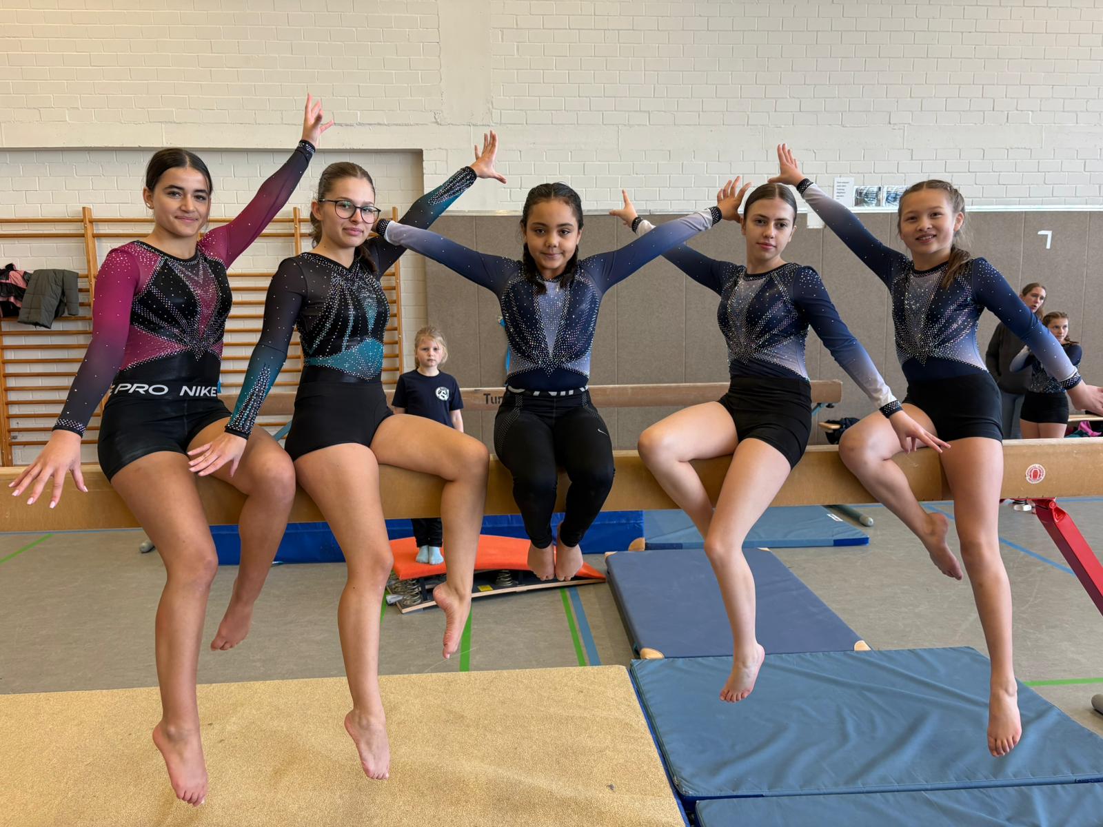 Die erste Mannschaft (Alya Atna, Nora Gärtner, Julia Küpper, Marie Müller, Alina Schmitz) turnte besonders am Boden sehr souverän. Trotz einigen Unsicherheiten am Schwebebalken erturnten sich die Mädchen den Tagessieg in der Altersklasse 09.