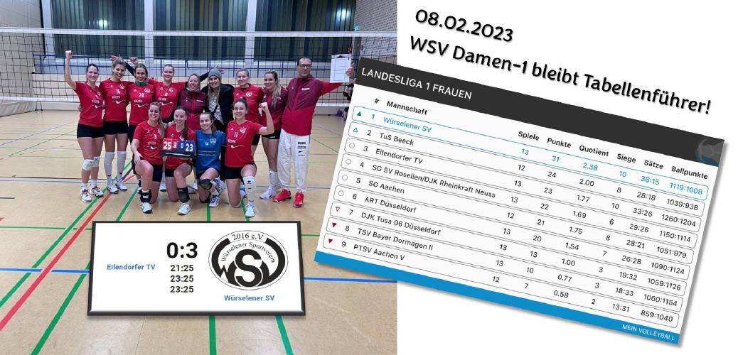 Das war ein ganz knappes Ding! In eigener Halle konnten wir die sehr starke Mannschaft vom Eilendorfer TV mit 3:0 schlagen. Bis zum Schluß lief das Spiel auf Augenhöhe mit langen Ballwechseln, da beide Mannschaften mit guten Abwehrleistungen den Ball immer wieder im Spiel hielten. Mit einem hauchdünnen Vorsprung je Satz konnten wir zum Schluß dann doch die wichtigen 3 Punkte einfahren! Damit konnten wir unsere Tabellenführung weiter ausbauen und haben jetzt mit TuS Beeck einen neuen direkten Verfolger.