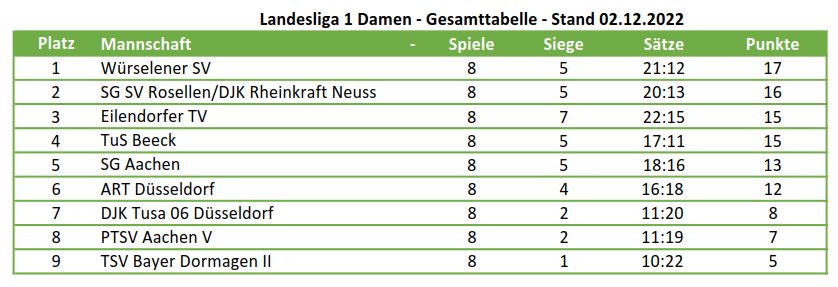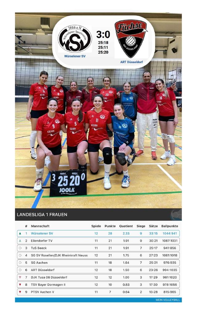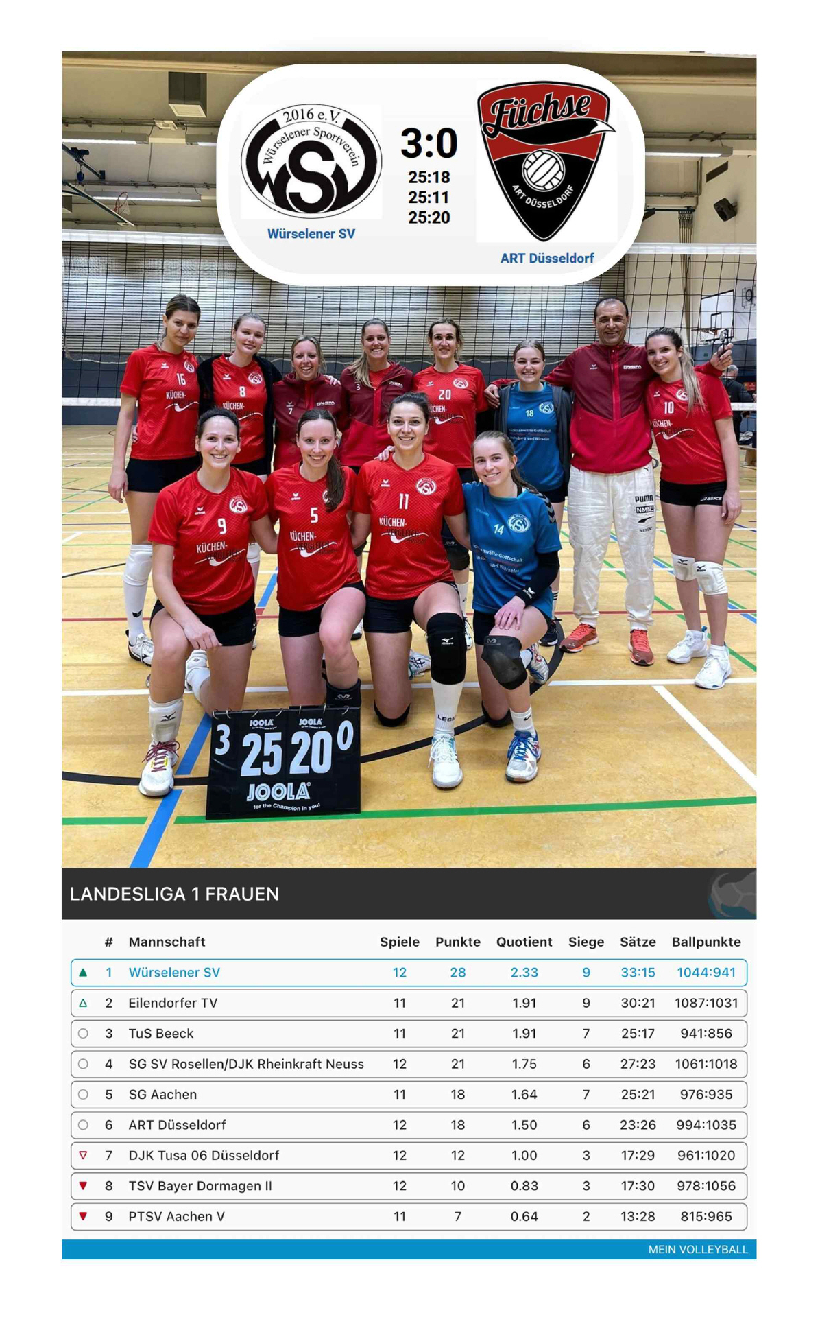 Das wohl bislang härteste Spiel fand am 15. Oktober 2022 in Neuss statt. Unsere Mädels trafen auf die spielstarke Mannschaft der ART Düsseldorf. In einem umkämpften Match kam unsere Mannschaft gut ins Spiel und sicherte sich den ersten Satz. Die beiden anschließenden Sätze gingen dann aber leider an die Mädels aus Düsseldorf, welche zu diesem Zeitpunkt besser im Spiel waren. Aber die Würselener Damen gaben nicht auf und sicherten sich den umkämpften vierten und schlussendlich auch den fünften Satz (25:17, 17:25, 23:25, 28:26, 15:13). Damit nahmen sie zwei verdiente Punkte mit nach Würselen und verbleiben vorerst auf dem zweiten Platz der Tabelle!
