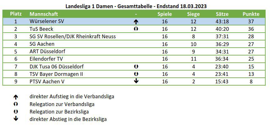 Die lange Anfahrt nach Düsseldorf am 05.03.2023 hat sich gelohnt. Mit einem glatten 3:0 Sieg gegen die Damen vom DJK Tusa06 haben wir unseren 1. Platz in der Tabelle verteidigt. Noch ist uns der TuS Beek dicht auf den Fersen, aber wir haben es jetzt am 18.03.2023 beim Spiel gegen den PTSV Aachen selber in der Hand den Aufstieg in die Verbandsliga klar zu machen.