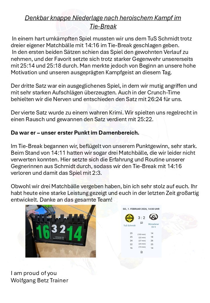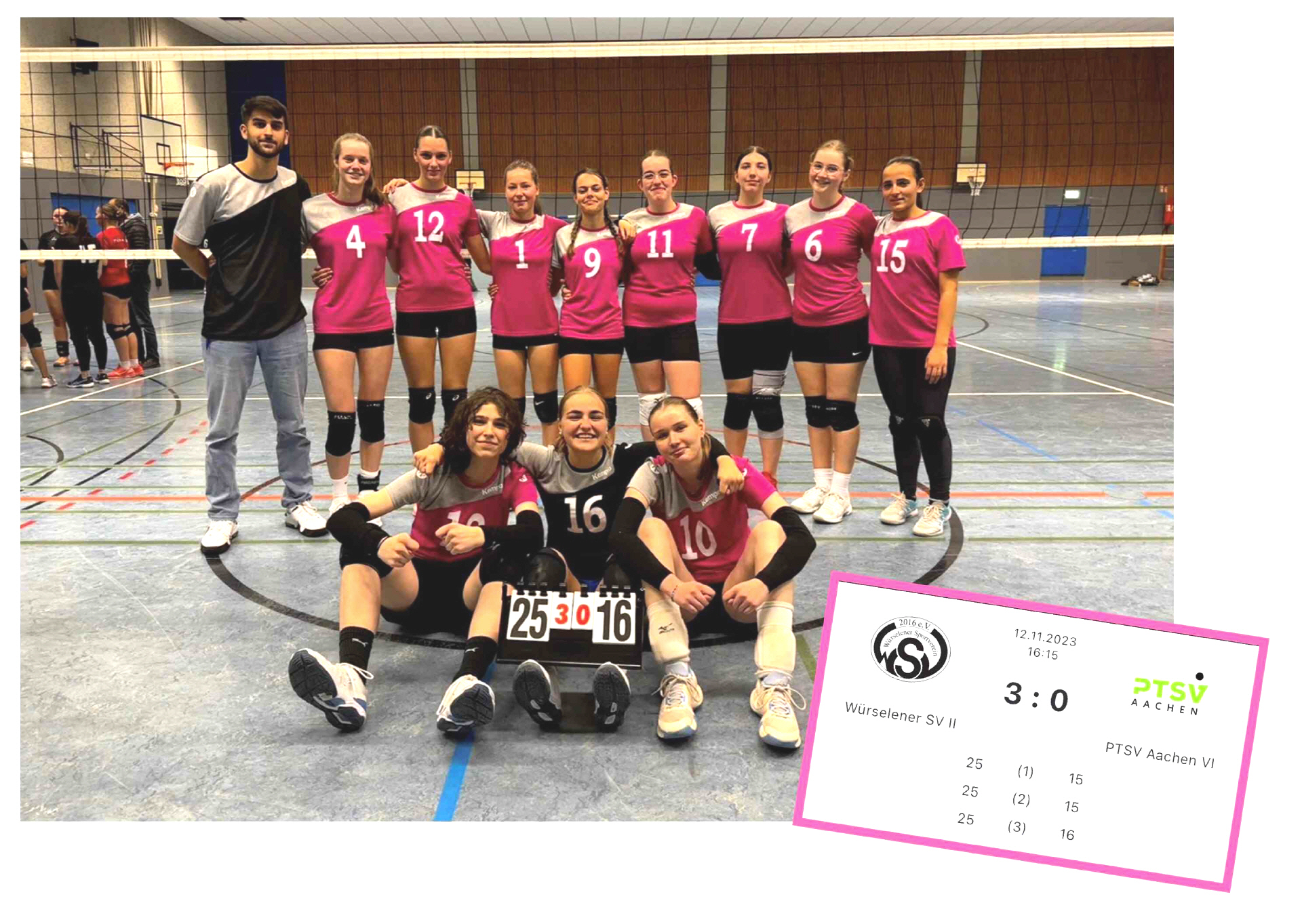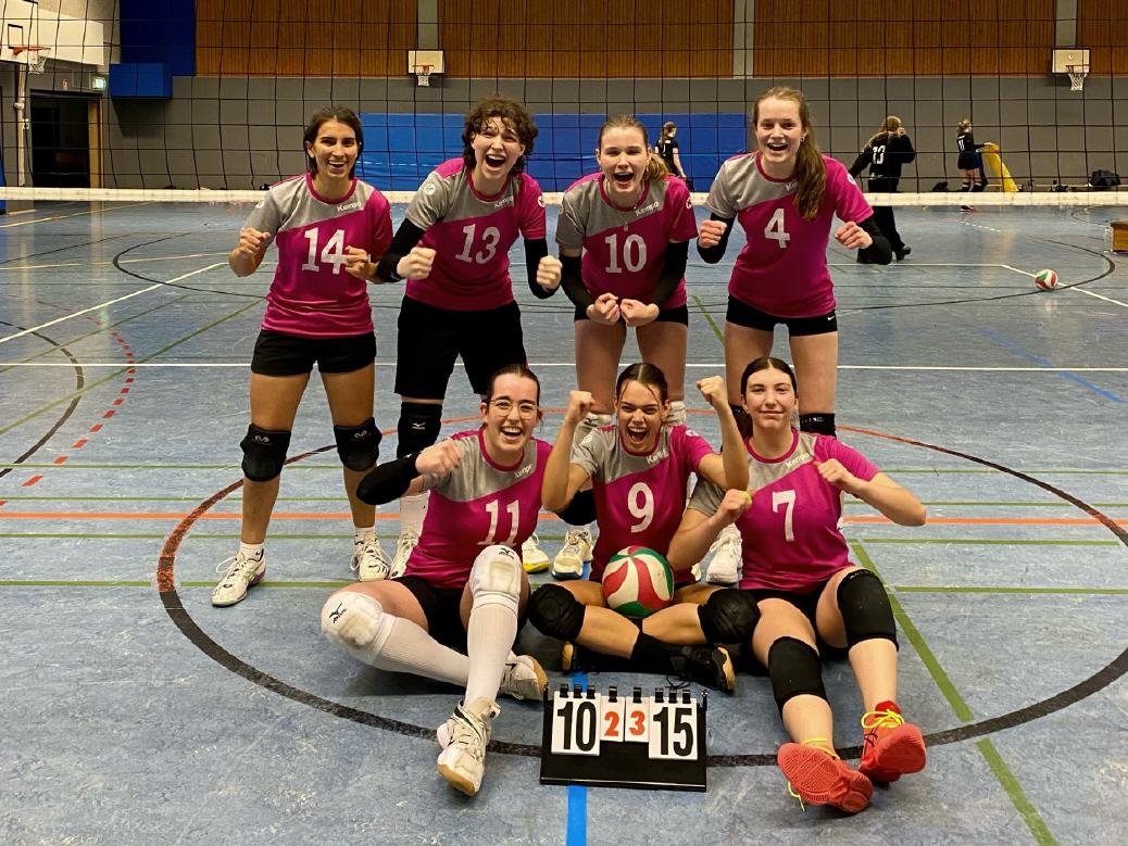Am 17.2.24 trafen wir in Baesweiler auf den Tabellenzweiten DJK Frankenberg. Leider mussten wir ohne unsere Libera auskommen. Mit starken Angriffen und vollem Körpereinsatz war es ein Spiel auf Augenhöhe. Bei sehr angespannter Stimmung musste der Tiebreak entscheiden. Hier lag Frankenberg stets mit 2 bis 3 Punkten vorne und bei 7:10 sah es für uns nicht gut aus, bis wir mit Katharinas toller Angabenserie den Satz mit 15:10 für uns entscheiden konnten.