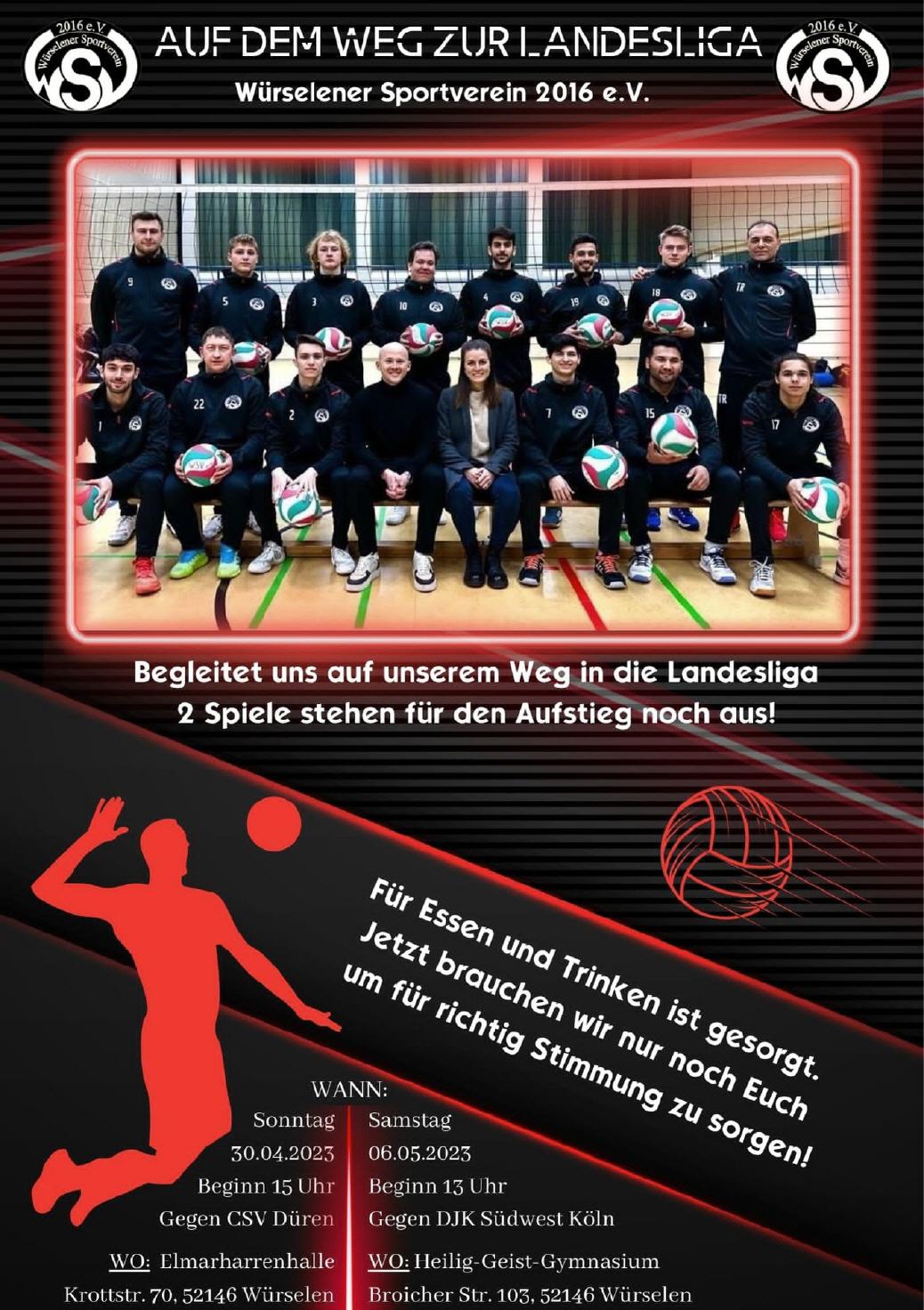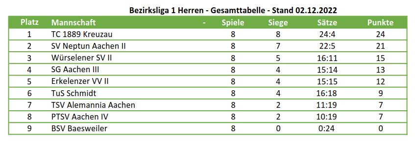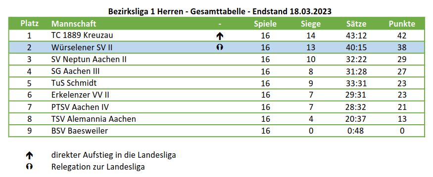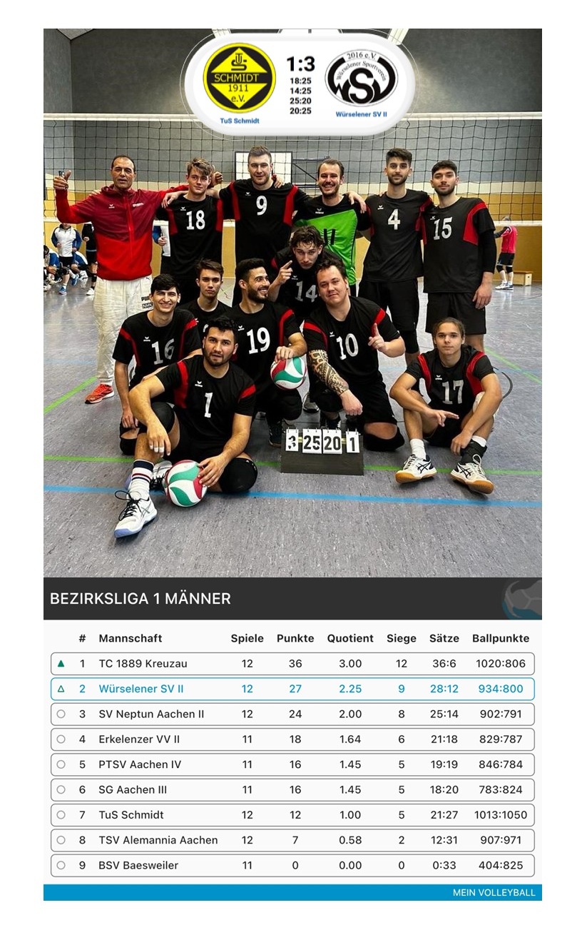 Am 23.02.2023 konnten wir vor eigenem Publikum den starken Gegner vom PTSV-Aachen mit einem 3:2 Sieg schlagen und haben uns nach 10 Siegen in Folge den 2. Platz in der Tabelle gesichert. Damit können wir bereits jetzt mit den Vorbereitungen zur Relegation in die Landesliga anfangen!